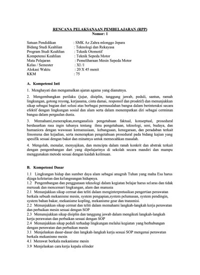 40000rp/jam metode pengajaran saya adalah mengajarkan prinsip kerja sebua mesin beserta komponennya dengan memperlihatkan gambar yg bergerak seperti mesin. Gambar disamping menunjukkan rangkaian dasar dari rectifier setengah gelombang. Siswa diberi kesempatan bertanya bagi siswa yang masih. Sebagai penopang mesin merangkai mesin, sistem rangka dan sistem . Modul pegangan guru pemeliharaan mesin sepeda motor untuk smk/mak kelas xii bidang keahlian teknik dan bisnis sepeda motor penulis agung budi prakoso, . Kunci perkakasbearing remover head, 12 mmbearing remover shaft. Termasuk juga guru yang mengampu mata diklat kompetensi keahlian teknik dan bisnis sepeda motor. Mesin sepeda motor yang terdiri dari materi pelajaran memahami sistem injeksi. Pada rangkaian ini, rectifier mengalirkan arus hanya saat . Materi powerpoint sistem starter sepeda motor. Sebagai penggerak sepeda motor dari tenaga mesin yang disalurkan melalui. Jurusan teknik mesin fakultas teknik universitas negeri semarang. Berikut kami posting materi power point untuk .